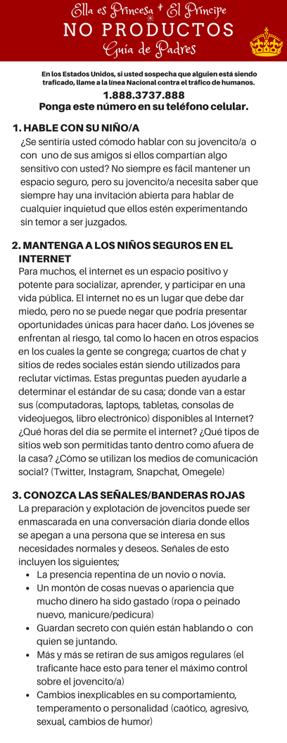 Un folleto para que los padres acompañen nuestra herramienta educativa No es un Producto. Incluye recursos del sitio web e información útil para armar a su hijo con el conocimiento para evitar que lo atrapen personas difíciles.